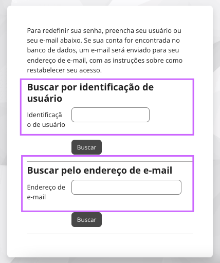 Na tela que abrir, insira o seu usuário e clique em "Buscar". Se desejar fazer a recuperação da senha pelo e-mail, preencha seu e-mail na segunda opção e clique em "Buscar".